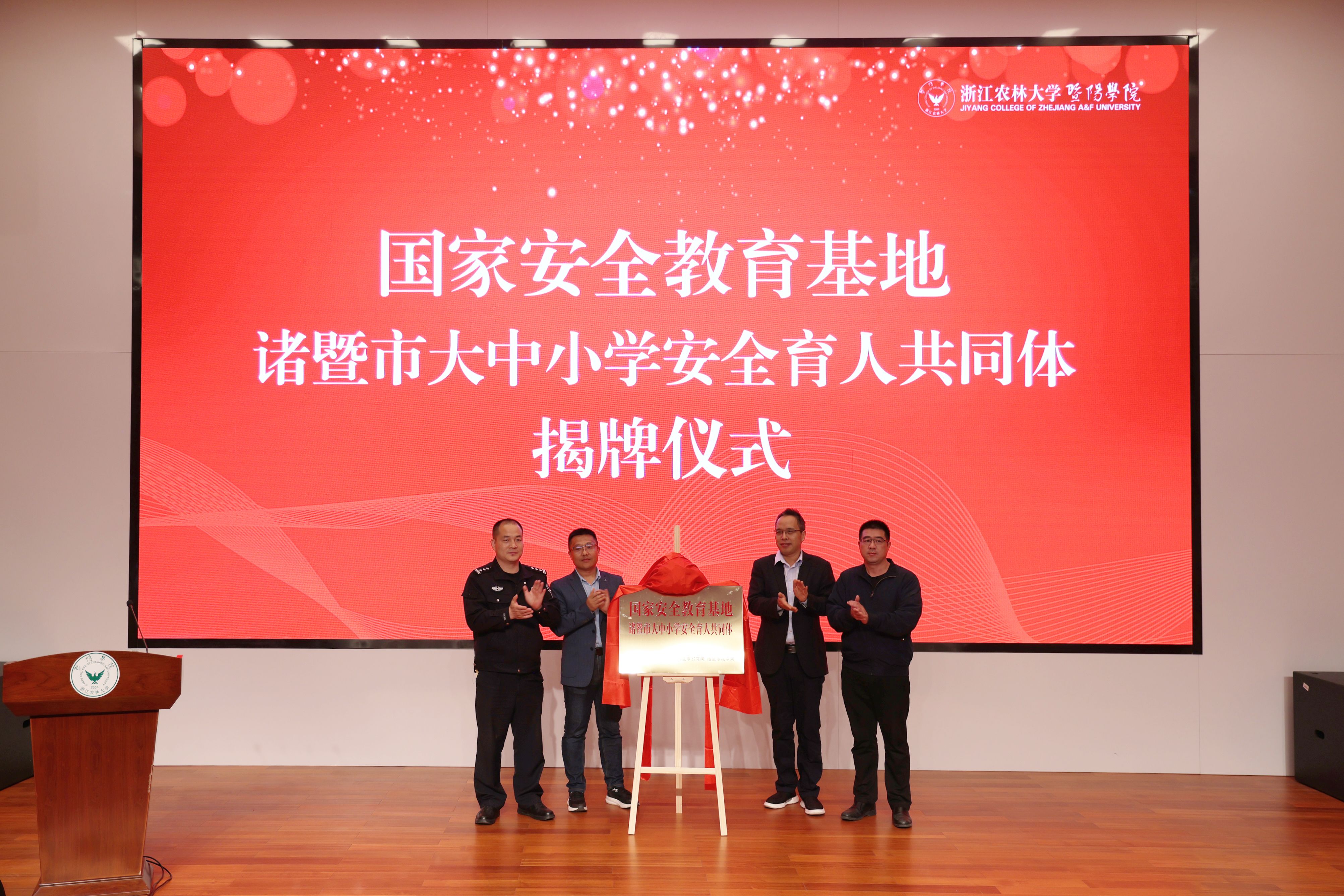 暨阳学院、诸暨市公安局、诸暨市教体局、城东派出所代表共同为国家安全教育基地暨诸暨市大中小学生安全育人共同体揭牌。
