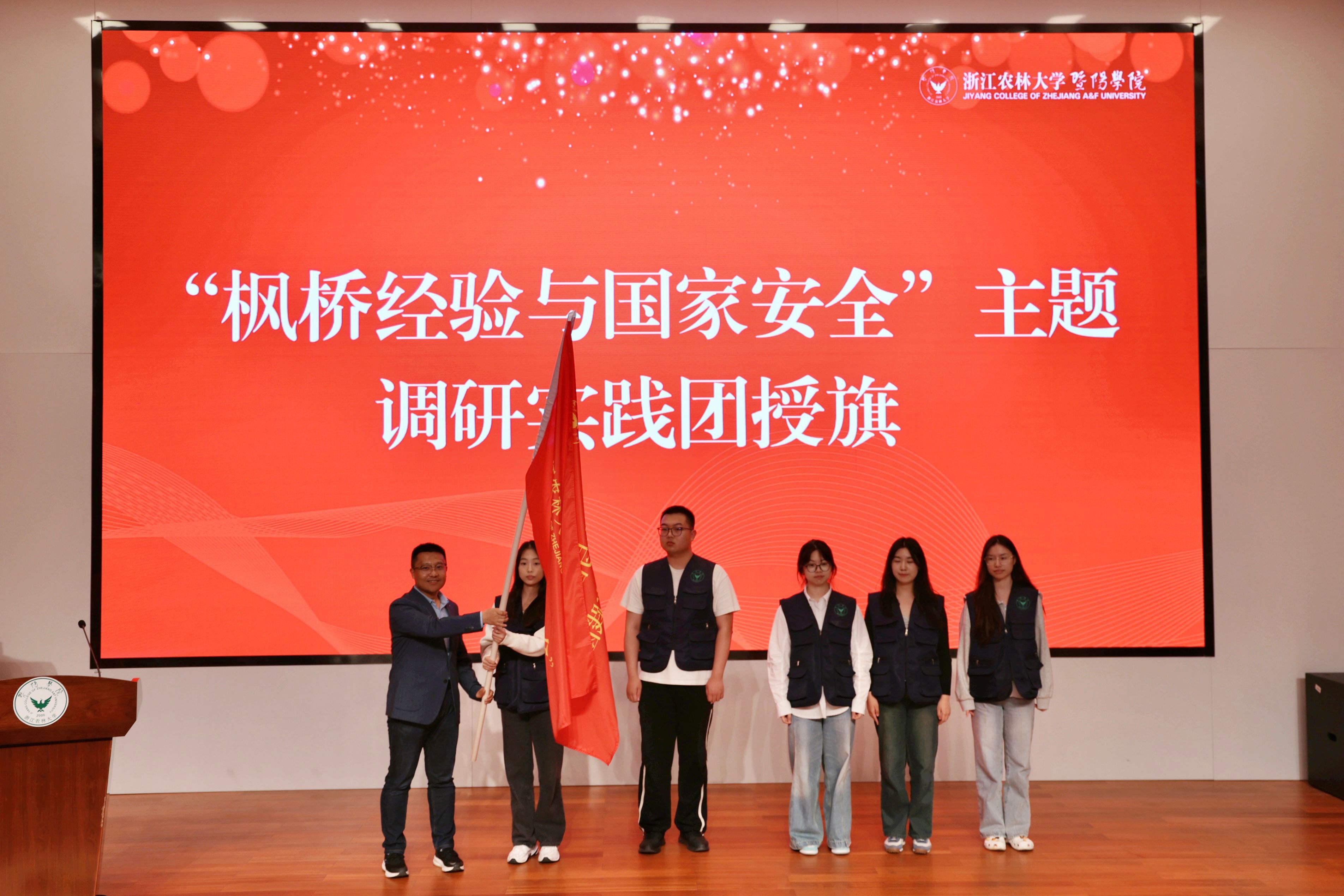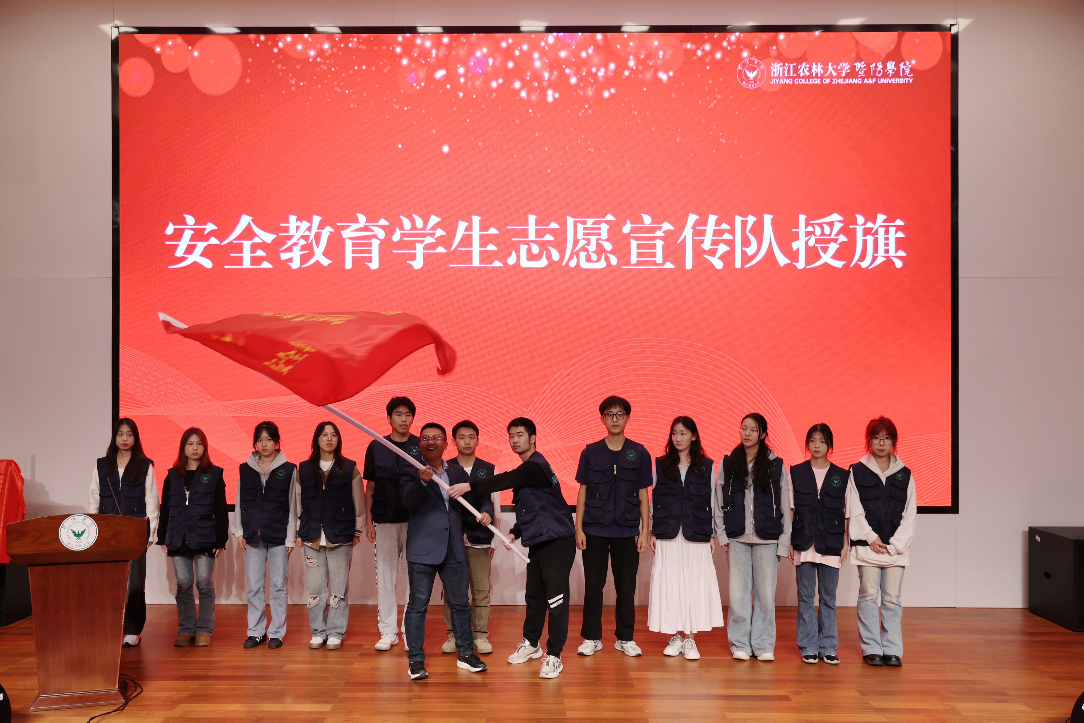 高国俊为安全教育学生志愿宣传队和“枫桥经验与安全”主题调研实践团授旗。